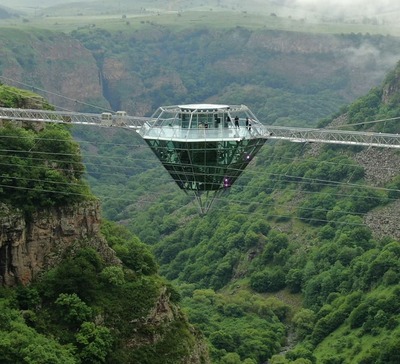 - The bridge hanging above Dashbashi Canyon -- two hours by car from the capital Tbilisi -- could inspire you to have a drink and enjoy the view at the gigantic diamond multi-level bar at its centre or ride across on a bicycle attached to a zip line.